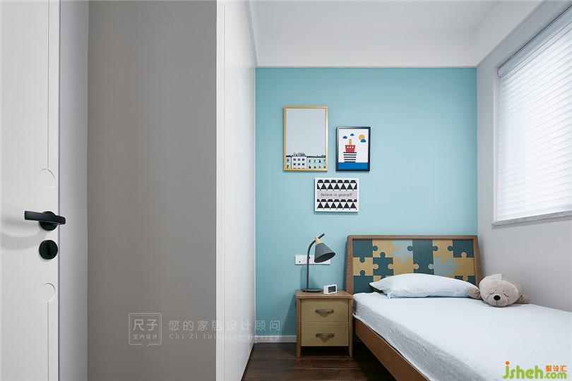 小孩房利用墻漆顏色,激活了整體簡潔的空間;拼圖狀的床頭,讓空間變得童趣十足。