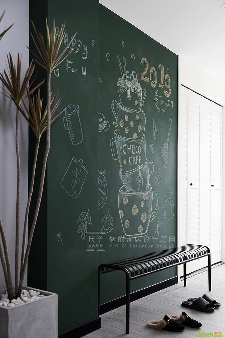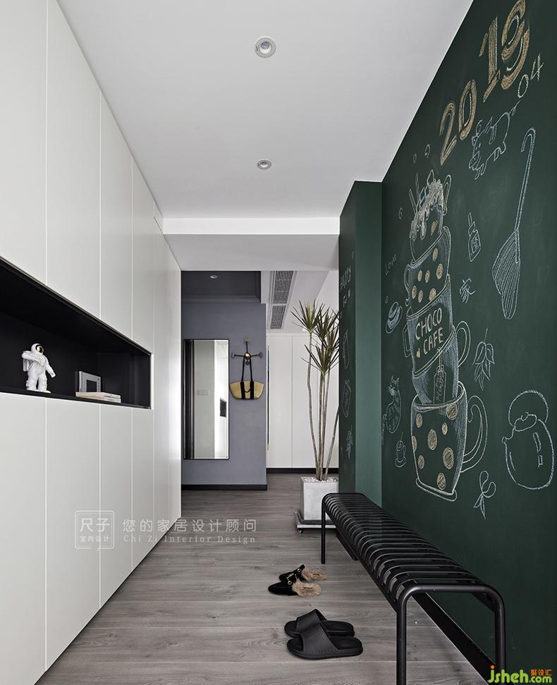 玄關(guān)空間是實(shí)用與藝術(shù)的交界地,到頂?shù)男P(guān)柜承載著這個(gè)家的收納重任;右側(cè)的黑板墻則是用來記錄一家人溫馨的點(diǎn)滴。深圳設(shè)計(jì)公司
