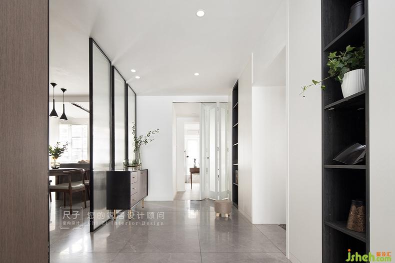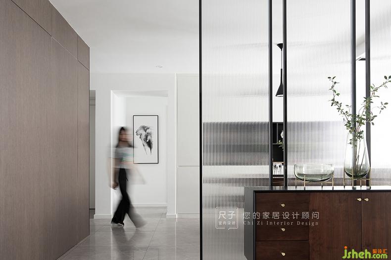 長(zhǎng)虹玻璃與胡桃木色矮柜構(gòu)成這個(gè)家的入戶端景。深圳設(shè)計(jì)公司