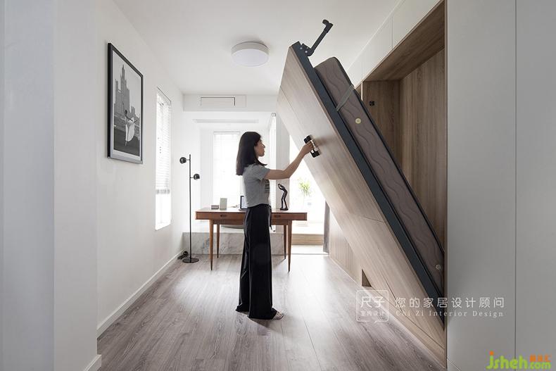 透光折疊門打造通透空間感,易移動(dòng)的書桌椅以及隱形壁床讓書房承擔(dān)起客臥的功能。