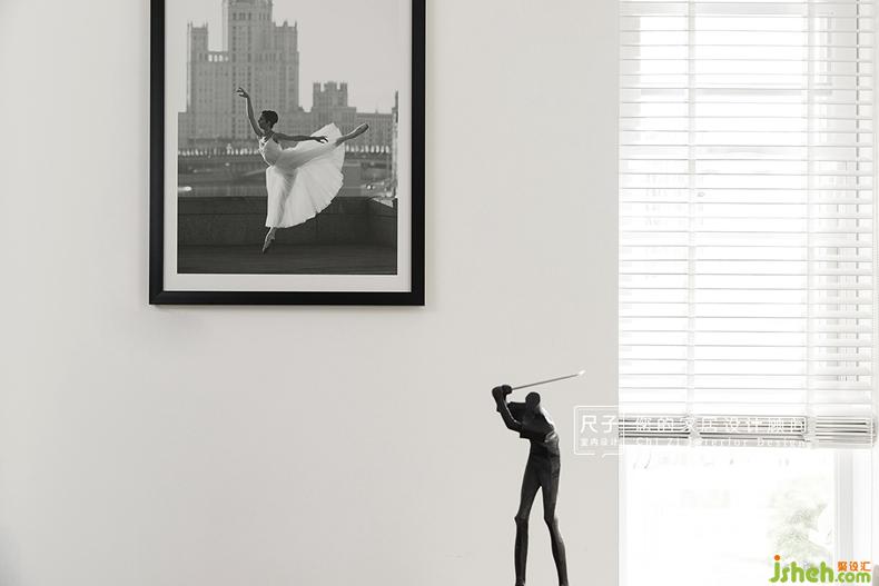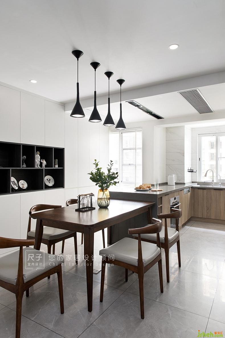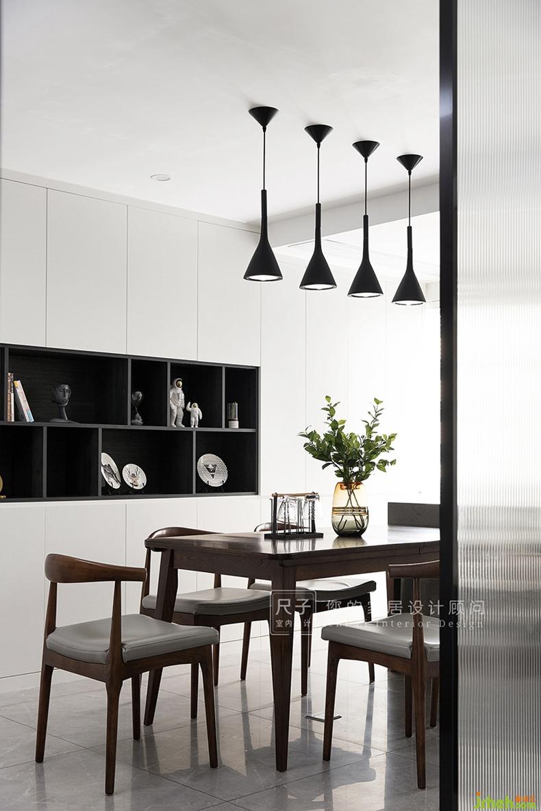 屏風背后便是餐廳區(qū)域,黑白灰以及溫暖的木色構(gòu)成整個空間的主色調(diào)。