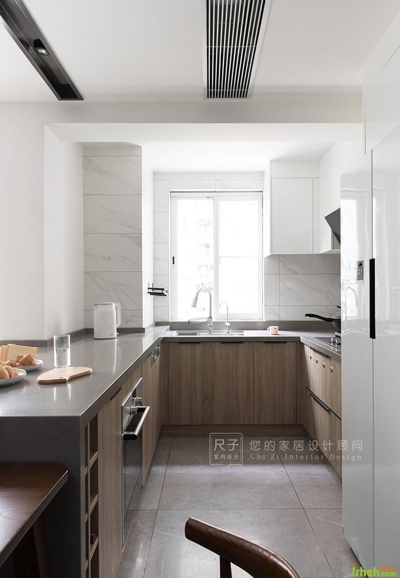 將廚房打通后增設操作臺,這塊區(qū)域?qū)⒉蛷d與廚房連接起來,一方面延伸了餐廚的功能,另一方面也是為了充分利用空間加強家庭成員間的互動。