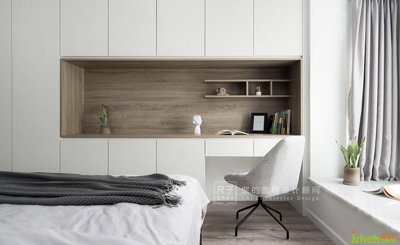 到頂?shù)囊鹿窠^對足以滿足日常收納,書桌與衣柜一體的設計,節(jié)省空間的同時讓主臥兼顧了閱讀、工作的功能。