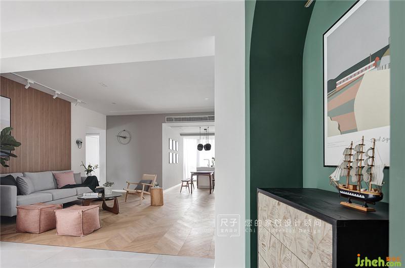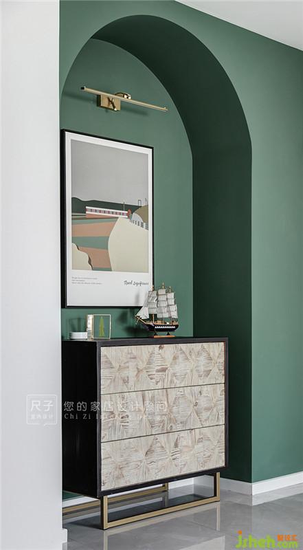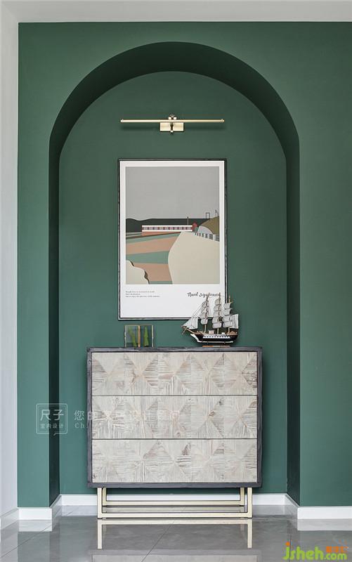 用色彩裝飾生活,墨綠色造型門洞自帶復(fù)古情調(diào),與掛畫一同描繪著我們關(guān)于這個家的初印象。