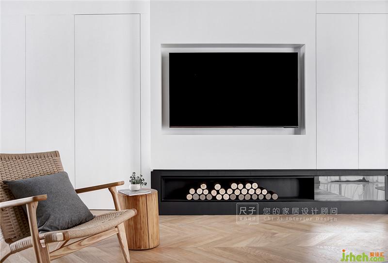 電視背景在滿足實用功能的基礎(chǔ)上,利用底部空間加點木材裝飾,做仿真壁爐的設(shè)計。