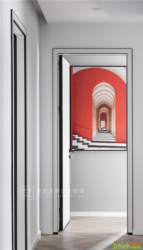過道是連接起各個(gè)空間的渠道,盡頭處的珊瑚紅裝飾畫,仿佛讓人有了在現(xiàn)實(shí)與畫中世界穿梭的錯(cuò)覺。