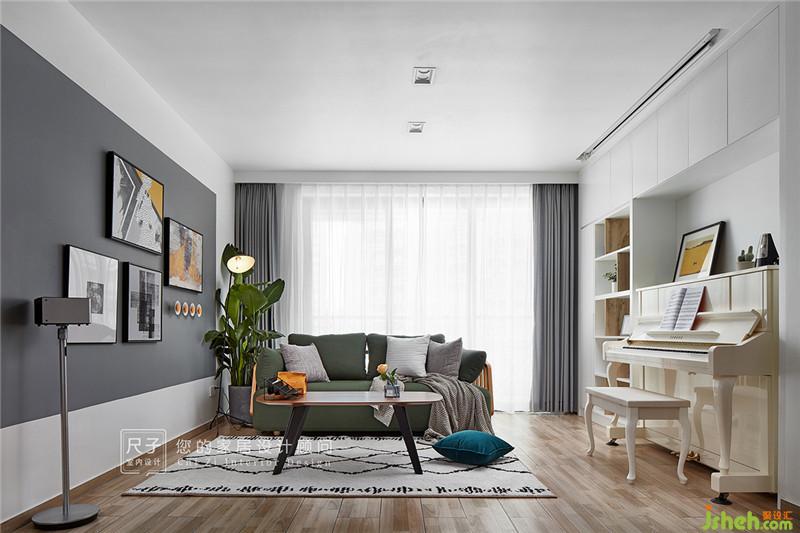 墻面局部分色的設計與大小不一的掛畫搭配,讓客廳氛圍滿滿。室內設計師