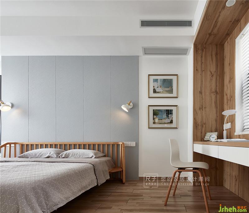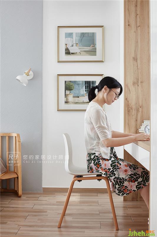 沿窗做書桌設(shè)計,以溫潤的木色包裹這片區(qū)域,與周邊的白色衣柜在色彩和質(zhì)感上產(chǎn)生對比,讓空間更富變化性。