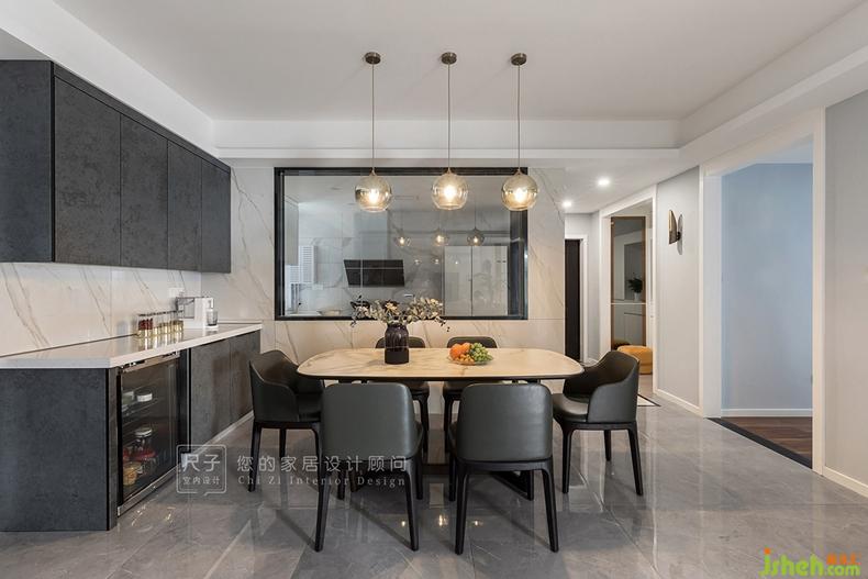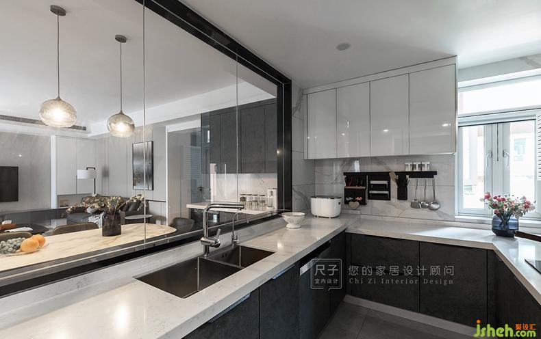 原戶型餐廚格局不方正,采光差,室內(nèi)設(shè)計(jì)師重新劃分餐廚空間,二者透過玻璃窗洞建立親密的聯(lián)系,玻璃材質(zhì)良好的采光性讓空間更加自然通透。