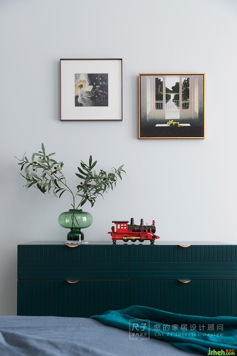 墨綠色矮柜搭配裝飾畫(huà),讓空間無(wú)端安靜起來(lái)。