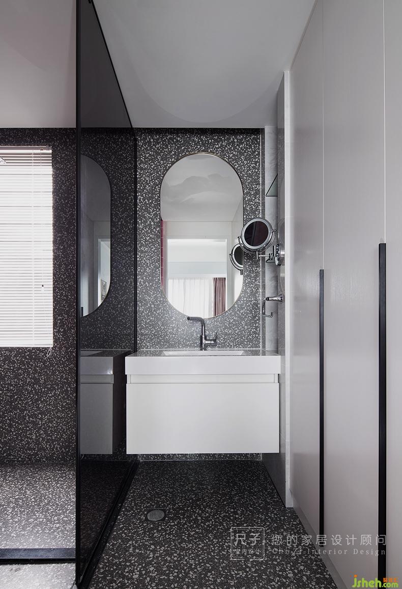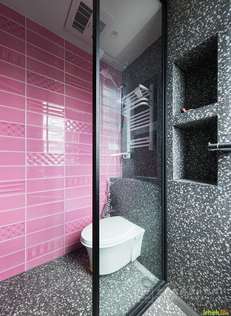 私密的主衛(wèi)空間,有粉紅小方磚與水磨石的大膽碰撞,也有灰玻與百葉窗對(duì)光影的詮釋。