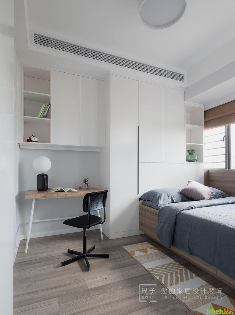 臥室原本面積較小,室內(nèi)設(shè)計(jì)師借用了部分公衛(wèi)空間擴(kuò)大父母房的使用面積,榻榻米與衣柜一體最大限度滿足收納儲(chǔ)物需求。