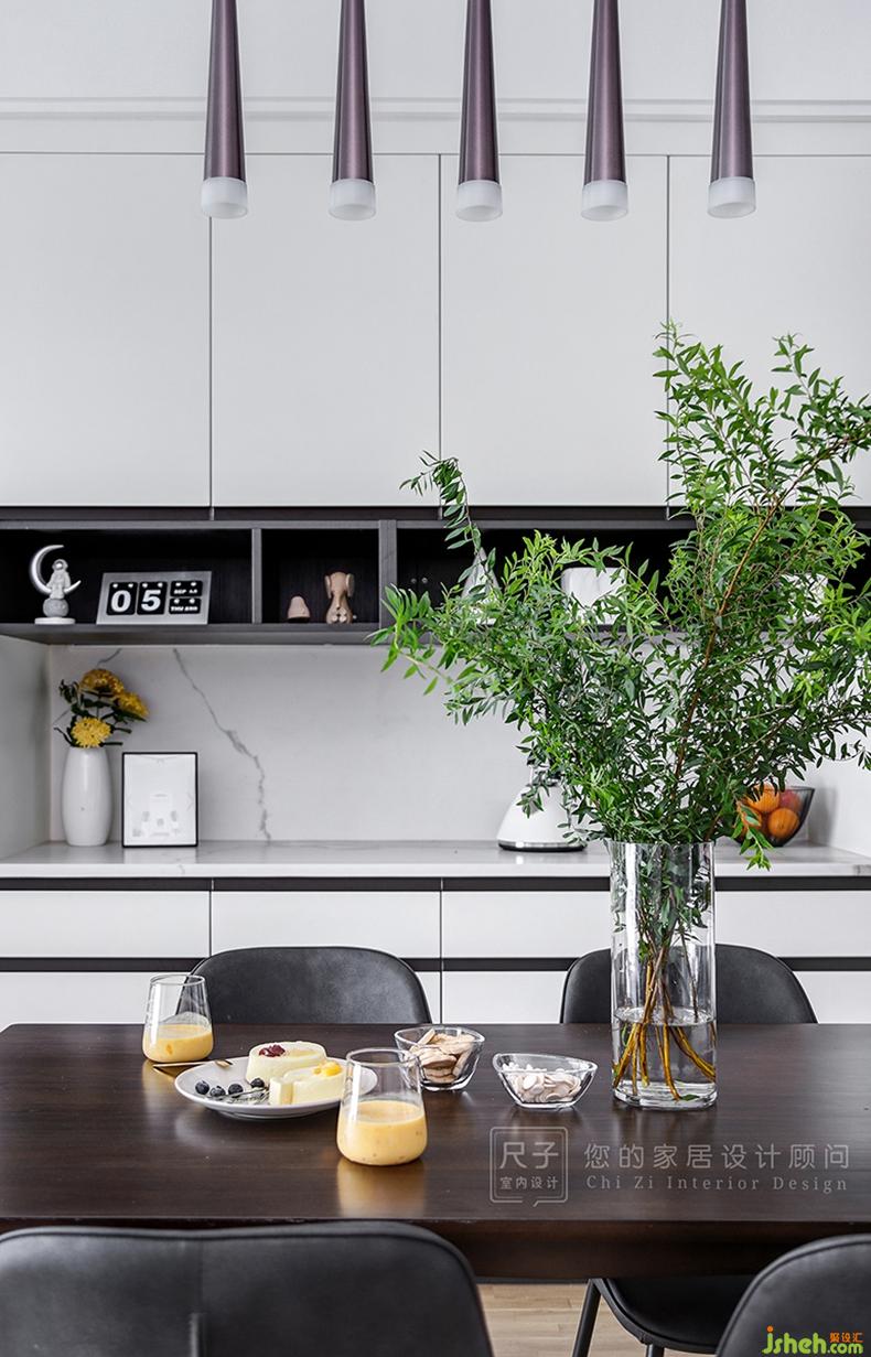 餐廳沿用了最初的黑白灰構(gòu)想,進(jìn)深600mm的餐邊柜收納功能強(qiáng)大,這里不僅是實(shí)用備餐區(qū),還可作為小西廚。