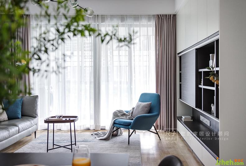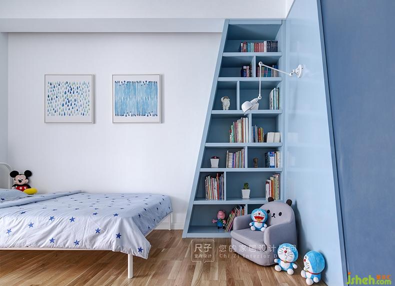 比客廳稍亮一度的藍(lán)色應(yīng)用在小孩房空間,帶來鮮活蓬勃的生氣;梯形書柜接護(hù)墻板,構(gòu)筑出一塊獨(dú)屬于孩子的閱讀角。