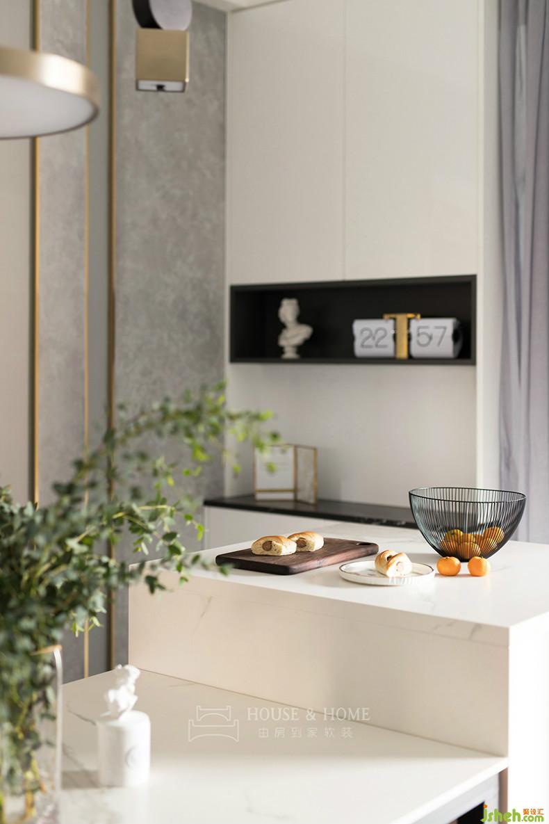 H小姐希望餐桌就只是用餐的媒介,而其他諸如娛樂、工作、交流的功能則交給另一個區(qū)域——小吧臺,室內(nèi)設(shè)計師平時可以在這一塊區(qū)域做做烘焙、手工,或是夫妻倆對飲一杯,享受浪漫屬性加成。
