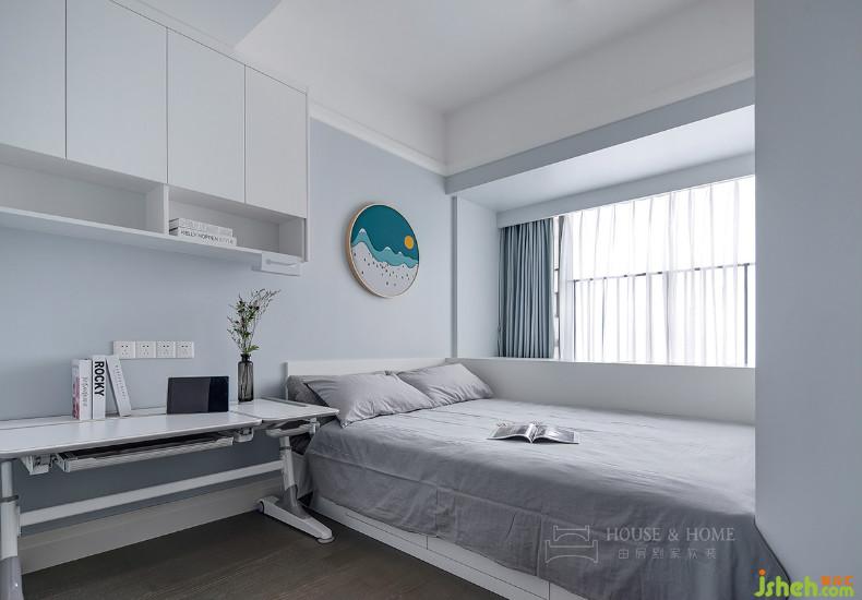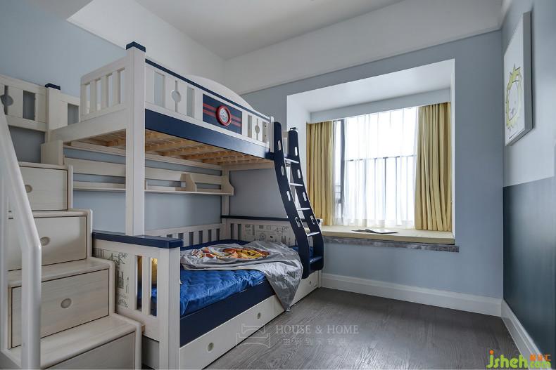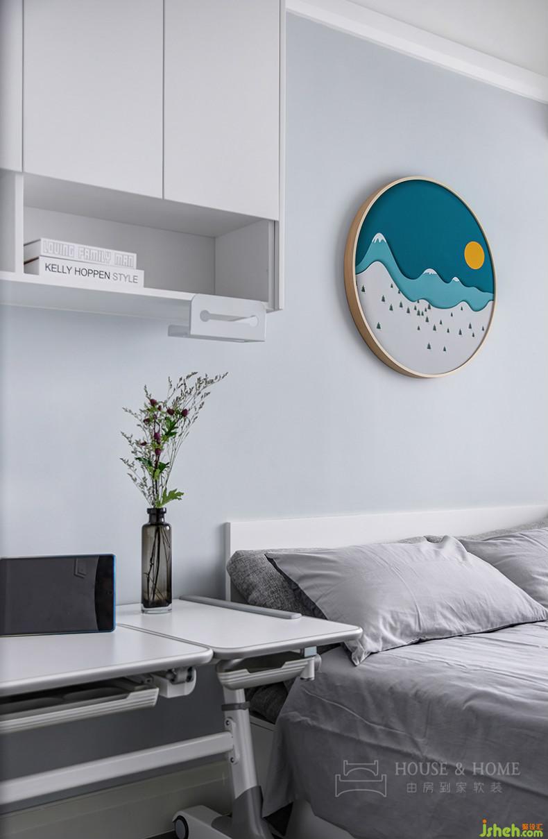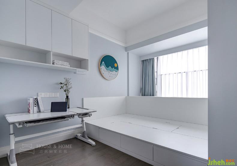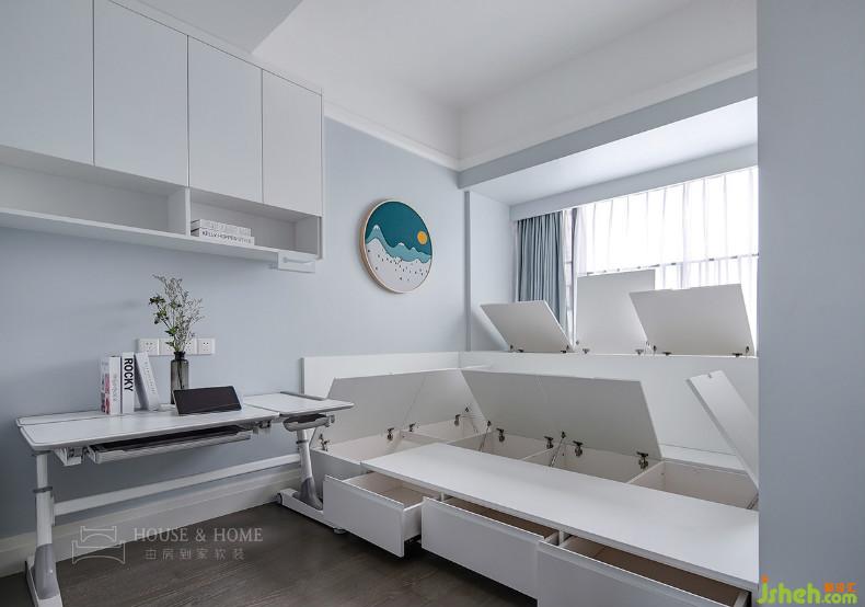 目前孩子年紀(jì)尚小暫不考慮分房睡,因此選用高低床。孩子成長(zhǎng)的不同階段,他們的的生活需求也會(huì)有所變化,室內(nèi)設(shè)計(jì)師在右側(cè)留白出大片空間,留待主人慢慢添加。