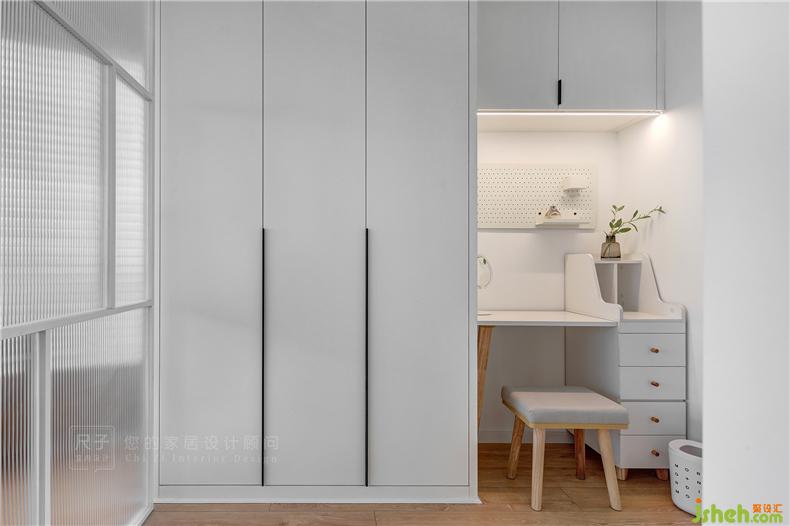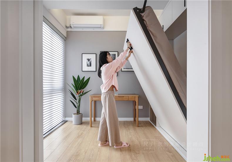 主臥延續(xù)整個家簡約溫馨的基調(diào),灰+木色構(gòu)筑足夠安靜的空間,安撫居住者忙碌一天的身心;通頂?shù)恼乓鹿駝t滿足實(shí)用需求。室內(nèi)設(shè)計(jì)師