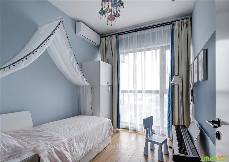 飽和度較低的藍(lán)色調(diào),營(yíng)造出恬靜舒適的空間維度;兒童椅、小帳篷給孩子的生活增添樂(lè)趣