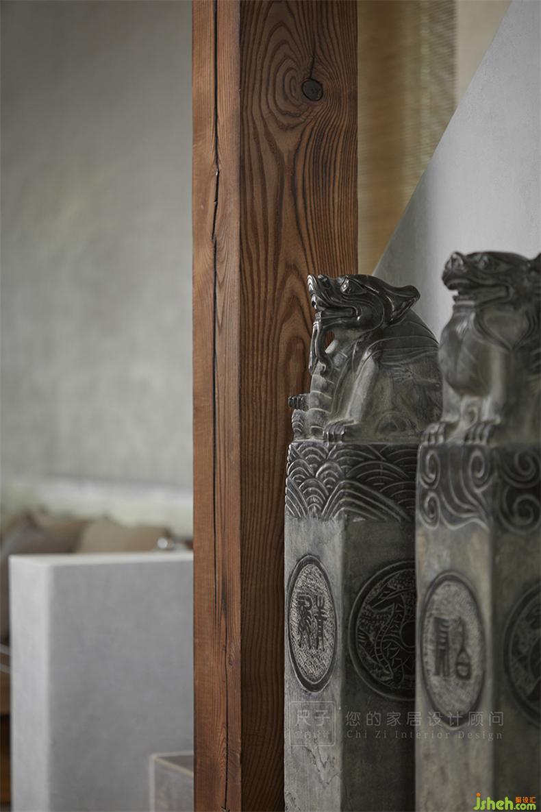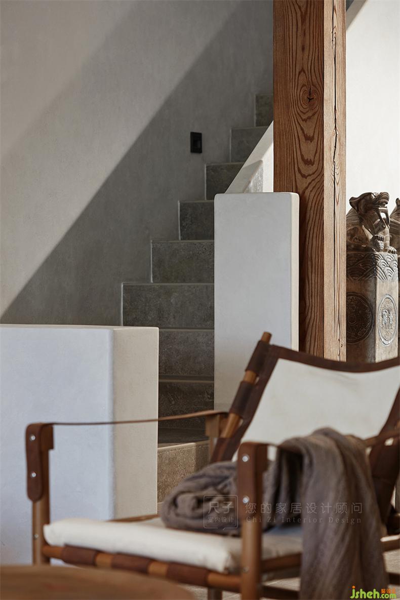 樓梯口擺放了一排拴馬樁,取門庭興旺之意。室內(nèi)設計師