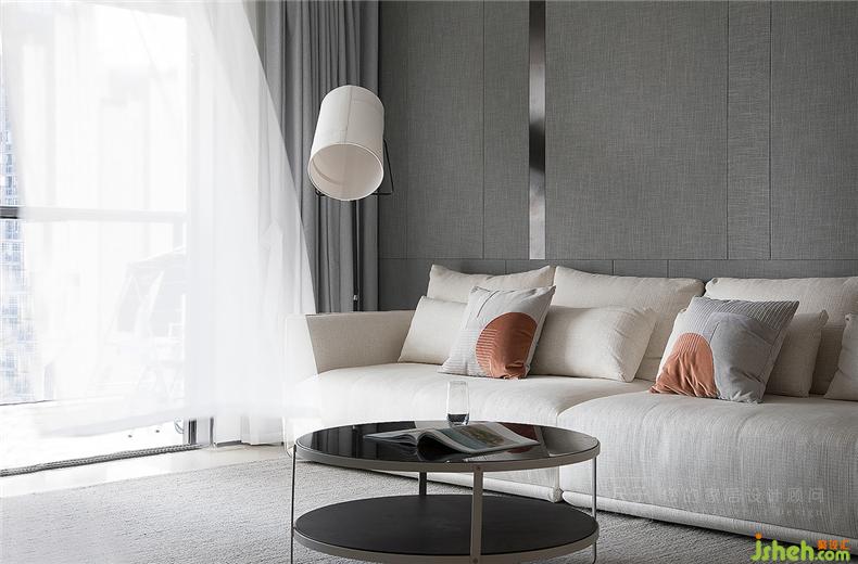 相對電視背景的硬朗,沙發(fā)背景采用更柔和的棉麻材質(zhì),不規(guī)則大小的深灰色硬包造型,再添加黑色不銹鋼窄條,錯(cuò)落有致與整體硬裝相呼應(yīng)。
