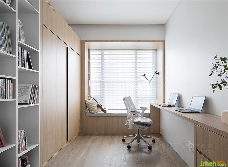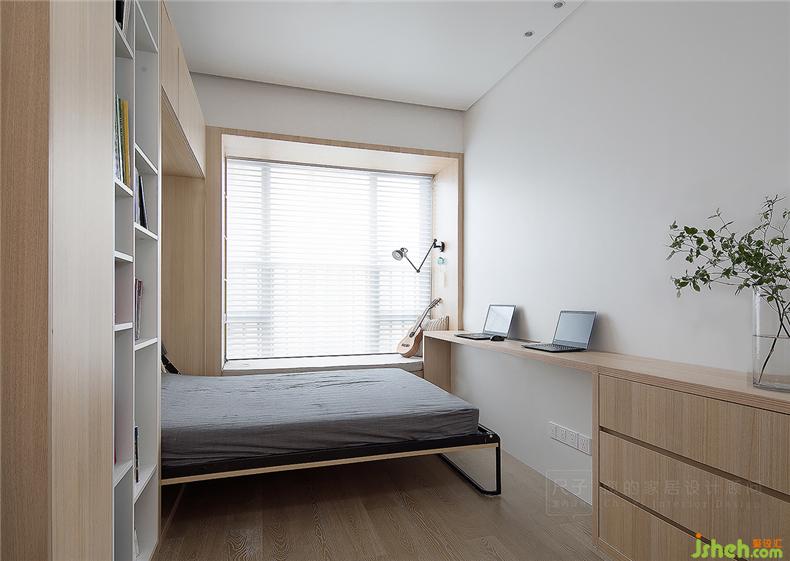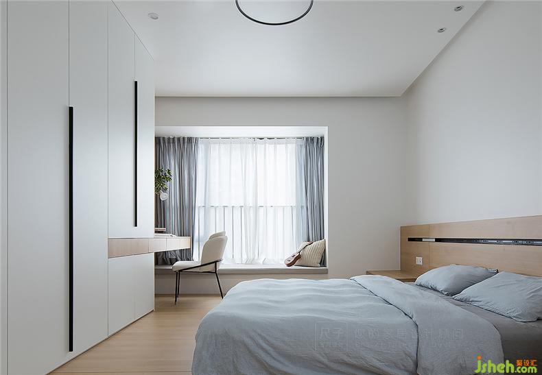 打破千篇一律的固化印象,地臺形式的主臥傳遞更自由的生活狀態(tài);衣柜與書柜結(jié)合,上下錯位的柜門拉手增加時尚造型感。