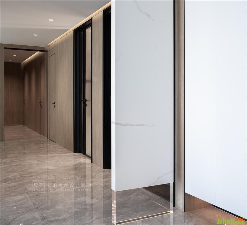每一處細(xì)節(jié)的斟酌都會(huì)帶來質(zhì)感的回饋。白色巖板底部拼接通透的亞克力材質(zhì),虛與實(shí)的對(duì)比,讓入戶顯得簡約卻不簡單。