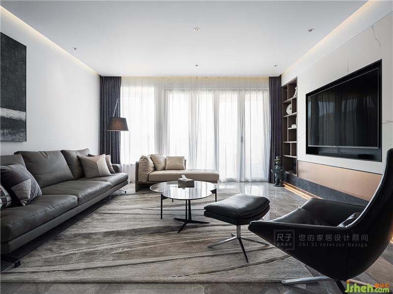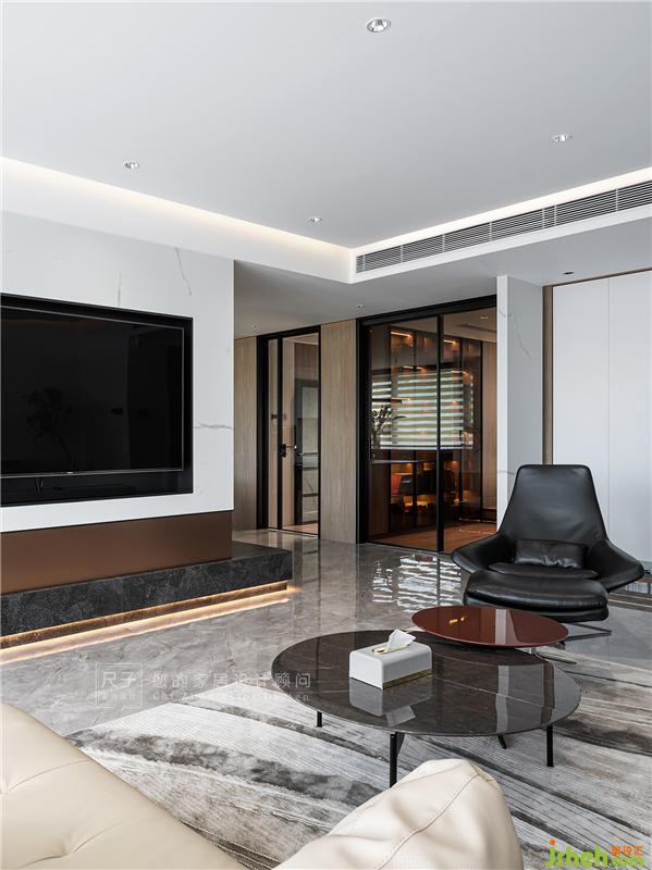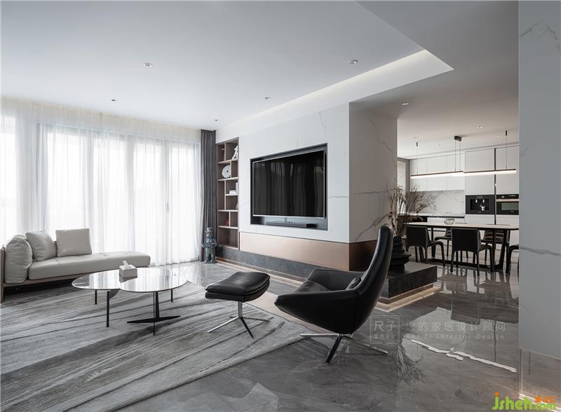 沉穩(wěn)優(yōu)雅的黑白灰、溫潤的木色與香檳色交織,內(nèi)嵌式設(shè)計(jì)的電視背景以及儲(chǔ)物柜,以不同色彩材質(zhì)的碰撞,豐富空間視覺表現(xiàn),凸顯生活品質(zhì)。