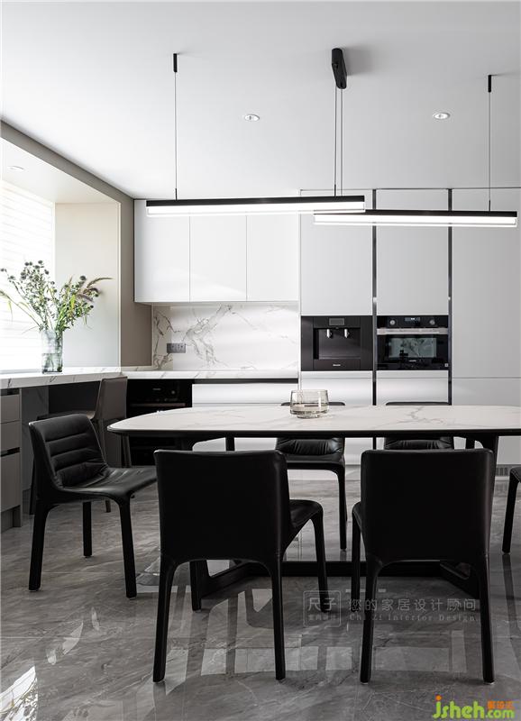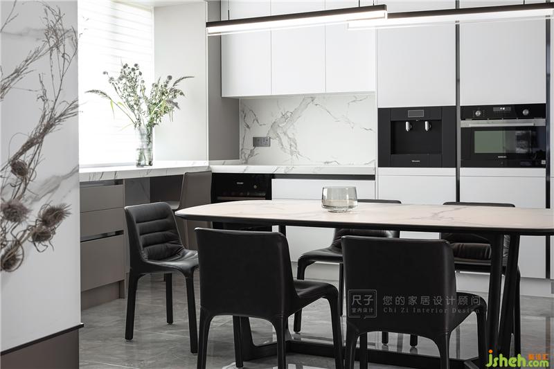 原家務(wù)間移至陽臺,給餐廳留出更多可利用空間,于是我們室內(nèi)設(shè)計(jì)師在整體布局上增設(shè)了西廚區(qū)與窗邊吧臺,為日常生活增添一點(diǎn)小情調(diào)。白色圓角方形餐桌,搭配舒適的黑色皮藝餐椅,讓用餐時光更顯溫馨。