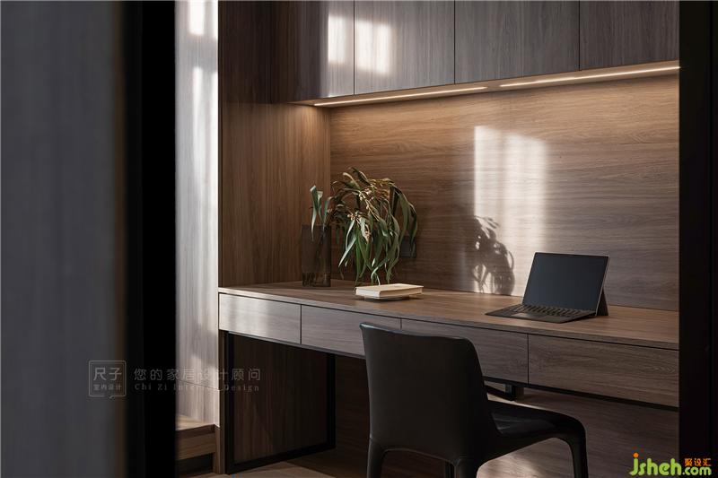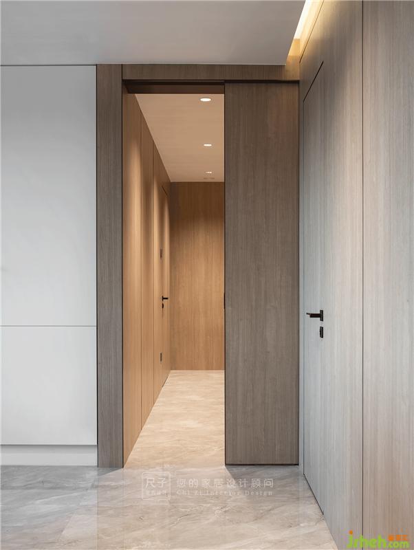 過道里墻體與房門選用原木作一體式表現(xiàn),暖黃的燈光下傳達(dá)出溫暖的感覺;連接休息區(qū)與餐廳的隱形推拉門,起到動、靜分區(qū)的作用。