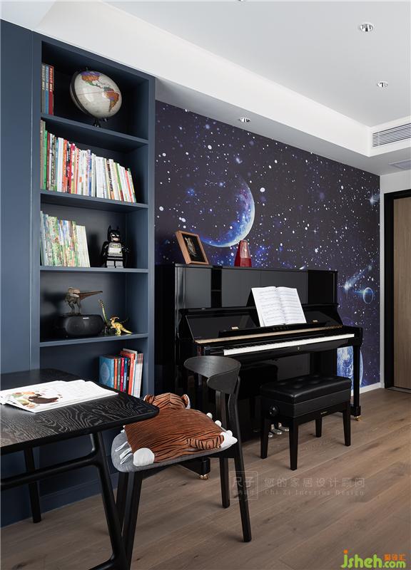 小孩房于進(jìn)門的一側(cè)墻面上裝飾出一片深藍(lán)色的星空,將鋼琴、書柜和書桌集中放置,讓小朋友在音樂和書本的太空里遨游。
