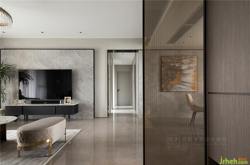 ①入戶巧用隔斷:以一扇藝術(shù)玻璃屏風(fēng),隔斷玄關(guān)與客餐廳,避免入戶門正對(duì)主臥門,緩解風(fēng)水上的尷尬