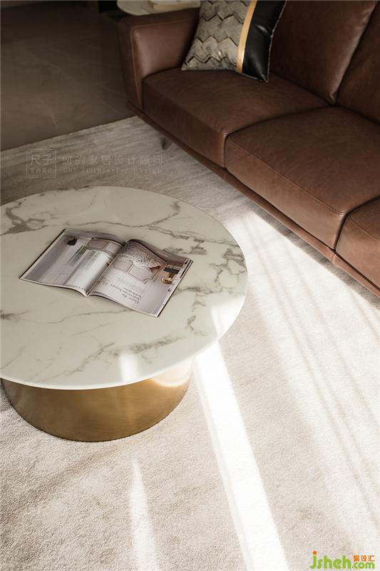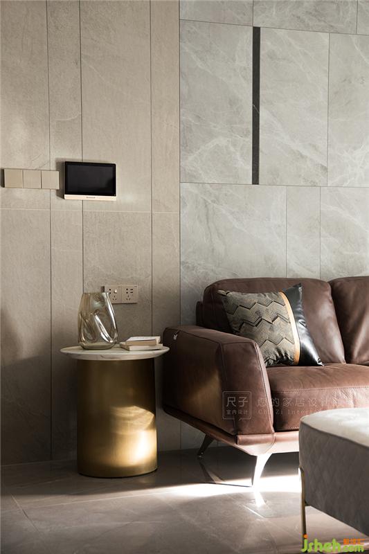 走進(jìn)客廳,沙發(fā)背景墻是塊面感十足的瓷磚組合體,墻面線條傳達(dá)出空間的秩序感;兩種色澤的瓷磚碰撞,加之沙發(fā)地毯的搭配,硬裝與軟裝揉合,以一種簡(jiǎn)練的手法來平衡空間冷暖關(guān)系。