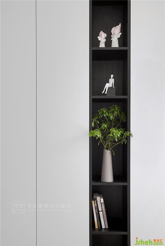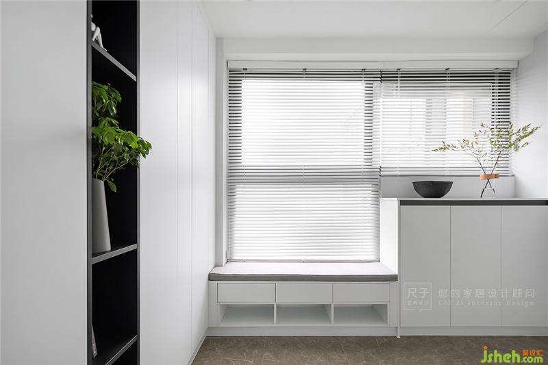 玄關(guān)處增設(shè)矮柜,便于坐下穿鞋,底部的開放格裝修設(shè)計(jì),方便放置常穿的鞋子。于優(yōu)雅大方的純白收納柜中嵌入豎向延伸的黑色開放格,線條利落,富有變化。陽(yáng)光透過(guò)百葉窗灑進(jìn)屋子里,十分通透。擺上些許小物件、綠植、書本,簡(jiǎn)約的空間里也不失生活的品質(zhì)感。