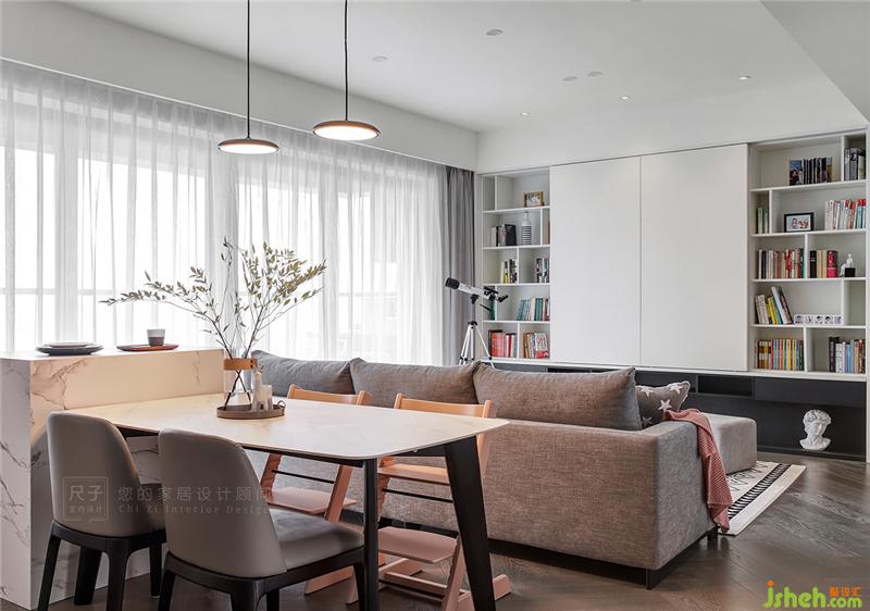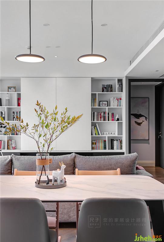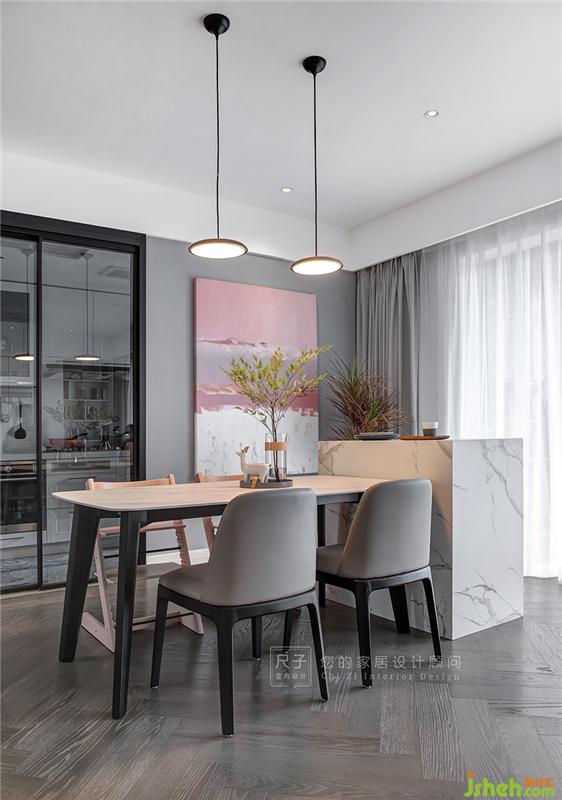 餐廳與客廳為一體化空間,開放式格局讓視線暢通無(wú)阻。粉色調(diào)的裝飾畫作為點(diǎn)綴,賦予黑白灰的空間里一抹靈動(dòng)與溫柔。