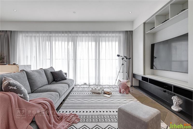 客廳主要滿足實(shí)用功能,采用無主燈照明,用點(diǎn)光源進(jìn)行組合,營(yíng)造出更為舒適的燈光氛圍、更為豐富的空間層次?;疑彳浀牟妓嚿嘲l(fā),搭配白色軟綿的地毯,減去茶幾后,便擁有了更多的活動(dòng)空間,給孩子一個(gè)玩樂的小天地,也便于親子之間的交流互動(dòng)。