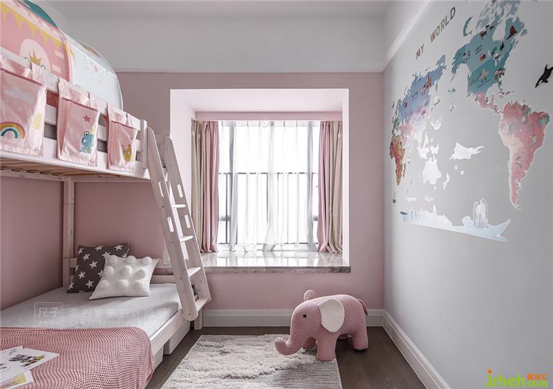 小孩房以溫柔的粉色為基調(diào),鋪上小地毯,擺上小玩具,房間充滿了童真與溫馨。右側(cè)白墻上是爸爸貼上的世界地圖貼畫,希望孩子在愛的世界里成長(zhǎng)。