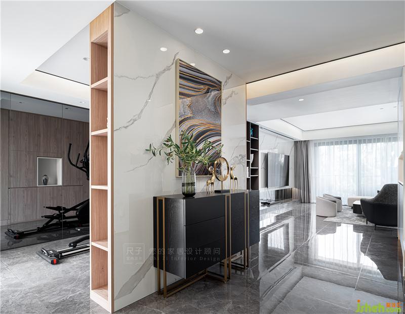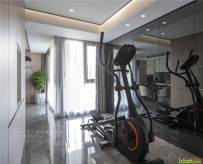 背后一側(cè)則是足夠?qū)掗煹男蓍e健身區(qū),以鏡面做墻,與柜子隔斷相對(duì)而立,一虛一實(shí),空間有了律動(dòng)變化。