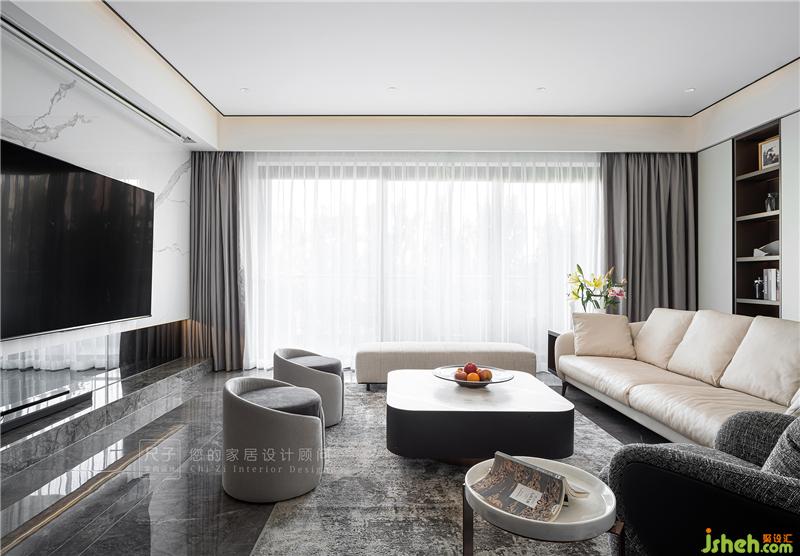 客廳設(shè)計(jì)以家人間的交流互動(dòng)為核心,淺灰與米色營(yíng)造溫暖舒緩的氛圍,圍合式的布局打造舒適便捷的溝通環(huán)境。