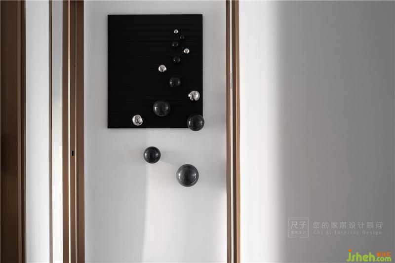 過道裝飾畫的選擇更為抽象,金屬球四散而落或升騰而起,空間中自由與優(yōu)雅的細膩情感在這里被不斷放大。