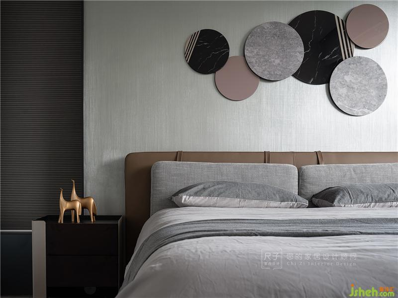 床頭一幅圓形組合晶瓷掛畫,與一側(cè)錯落的吊燈相呼應,讓空間在點線面的排布中有著熟稔自如的轉(zhuǎn)換,且蘊藏豐富的細節(jié)。