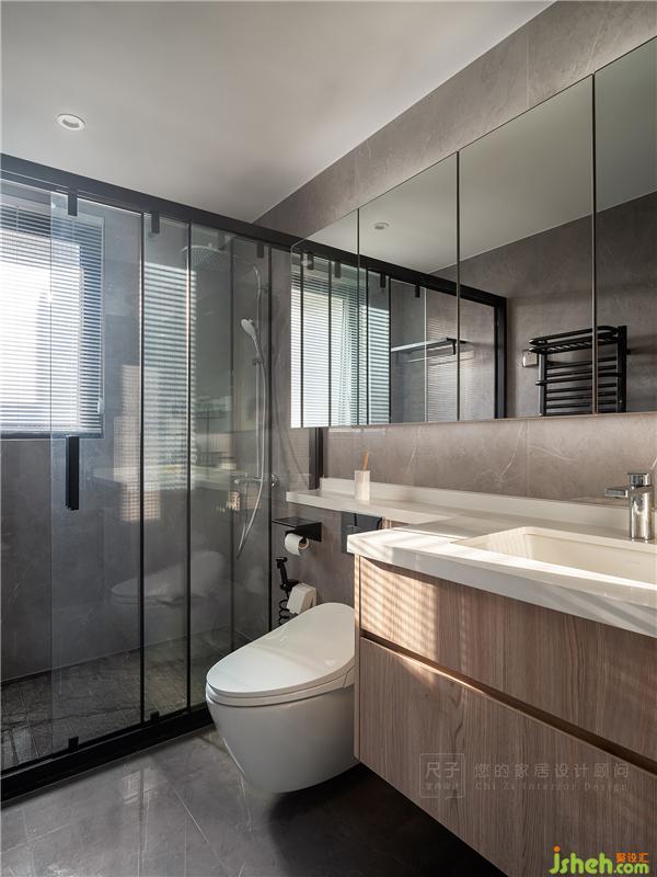 衛(wèi)生間設計依然遵循著實用原則:鏡柜內(nèi)藏了強大的收納功能,洗漱區(qū)臺面延伸至馬桶后方,小空間的立面收納運用到極致。