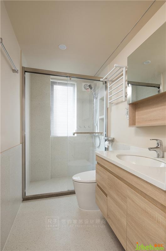 與全屋的風(fēng)格一致,衛(wèi)生間采用原木色的柜子,透明玻璃門做隔斷,干濕分區(qū),讓整個(gè)空間通透明亮。