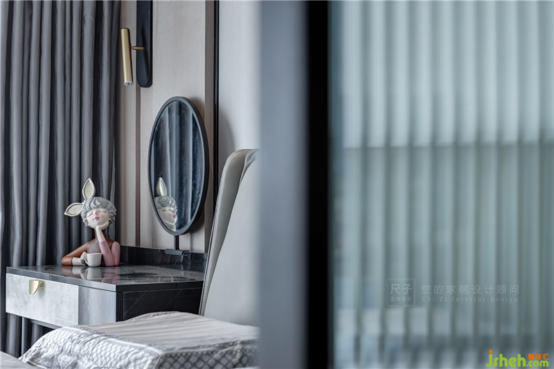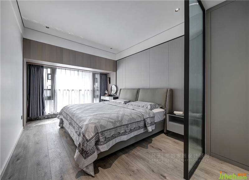 進(jìn)門處的屏風(fēng)帶來若隱若現(xiàn)的神秘感,將臥室的溫柔藏在其中;屏風(fēng)也起到了遮擋作用,避免衛(wèi)生間門正沖床。