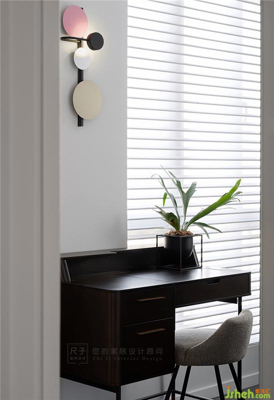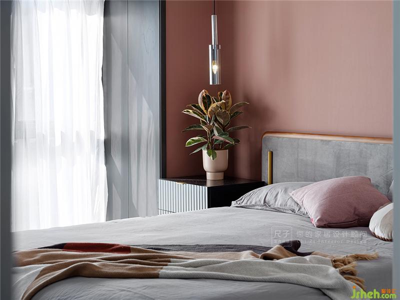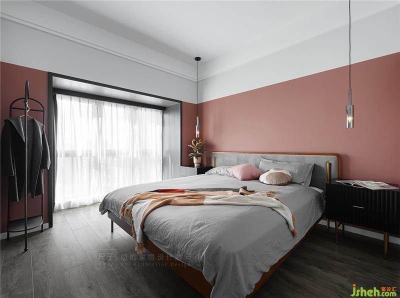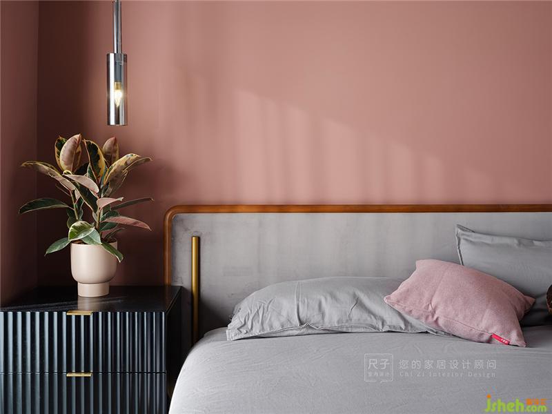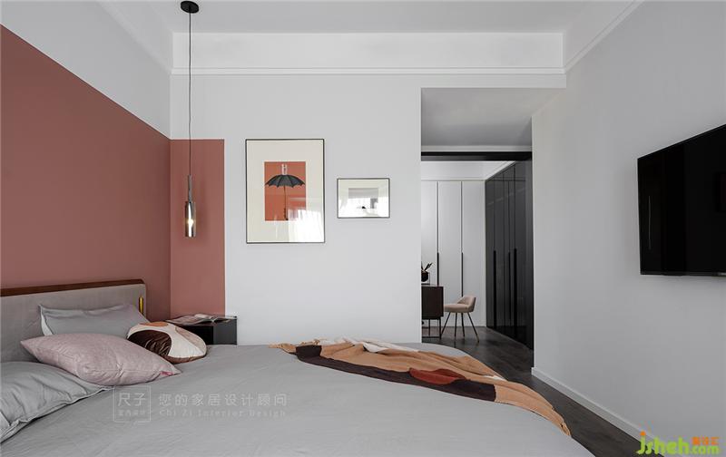 臥室以煙粉作為主色調,煙粉色從床頭向兩側延伸,形成半圍合的狀態(tài),給居住者足夠的心里安全感;黑白色的穿插又讓大面積的粉色不會過分甜膩。