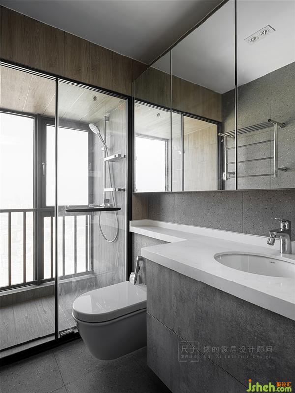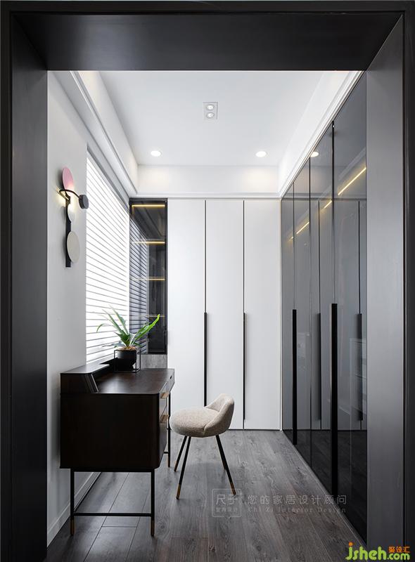 另一側是小臥室改成的衣帽間,設計了兩排帶門的收納柜,為了整體通透性,一面柜子選用了黑色半透明玻璃門,簡約不失質感。
