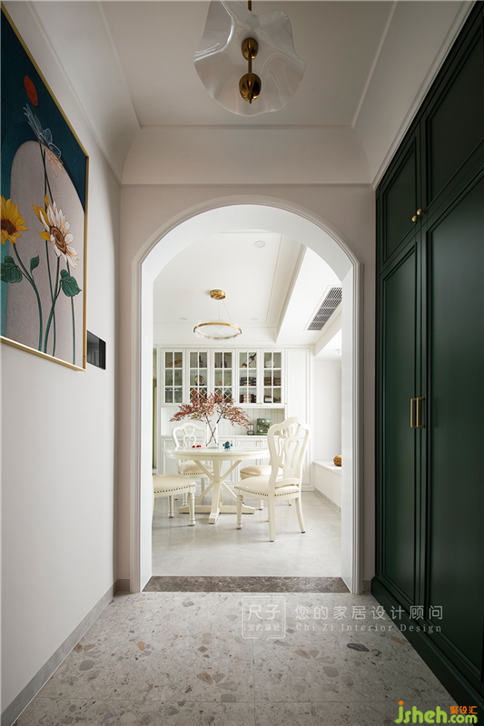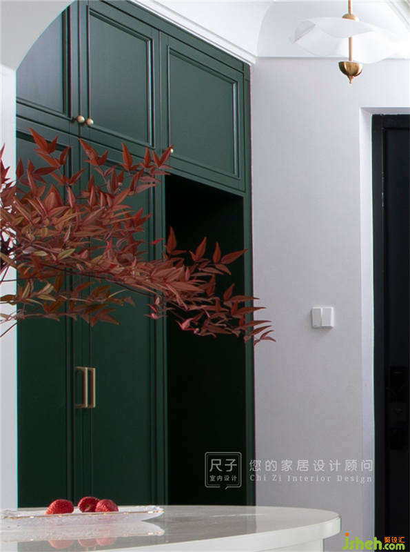 從室外邁入,濃重的墨綠色柜門自帶優(yōu)雅復(fù)古的氣質(zhì),造型門洞恰到好處地增加了線條的柔和感。
