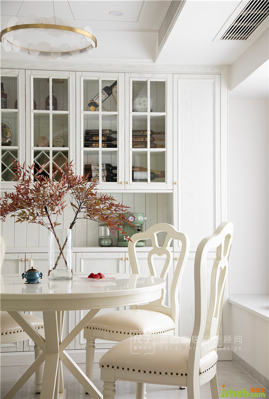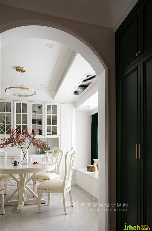 穿過門洞,是精致實(shí)用的用餐區(qū),大面飄窗為屋內(nèi)引入充足的自然光線,在白色木質(zhì)桌椅的映襯下,空間顯得更為明亮通透。