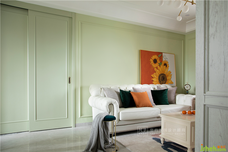 軟裝上,設(shè)計(jì)師減少復(fù)雜元素的堆砌,將業(yè)主喜愛的綠色融入到家居環(huán)境中,家居設(shè)計(jì)營造簡(jiǎn)潔明快的視覺效果,溫馨與浪漫的居家氛圍。
