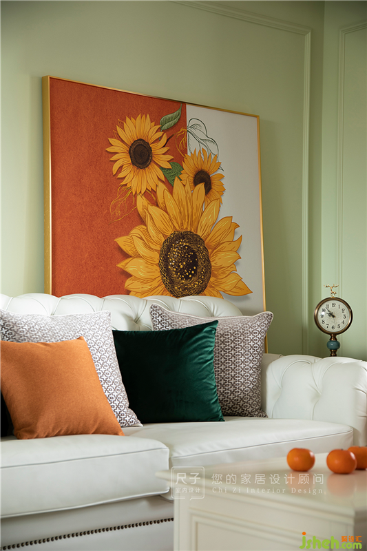 清透的綠色調(diào)游弋在客餐空間,搭配向日葵裝飾畫,對(duì)比強(qiáng)烈,大膽的配色讓室內(nèi)空間煥發(fā)節(jié)奏與活力。