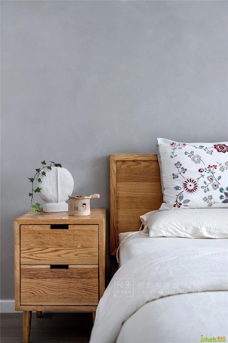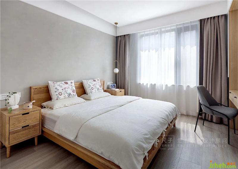 灰白木三色交織,百搭的色彩奠定臥室溫潤寧靜的氛圍。床尾的一排儲物柜與梳妝臺結(jié)合,滿足了男女主人的實用性需求。